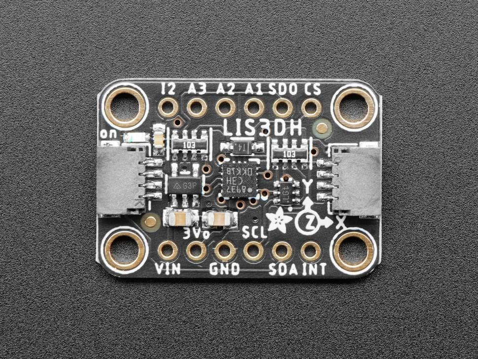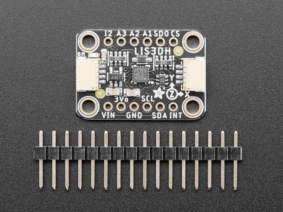 El LIS3DH es un acelerómetro triaxial de bajo coste y bajo consumo con múltiples funciones. Ofrece detección en tres ejes y una precisión de 10 bits con opciones de escalado seleccionables de ±2 g, ±4 g, ±8 g y ±16 g. El chip es compatible con las interfaces I2C y SPI, con múltiples opciones de velocidad de datos que van desde 1 Hz hasta 5 kHz.