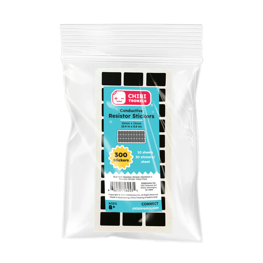 Las pegatinas de resistencias conductoras son componentes de resistencias planos y amigables con el papel, en una forma conveniente de despegar y pegar. Intégralas fácilmente en tus circuitos de papel para equilibrar el flujo de corriente, asegurando que todos los LEDs se enciendan de manera uniforme sin un consumo excesivo de energía.