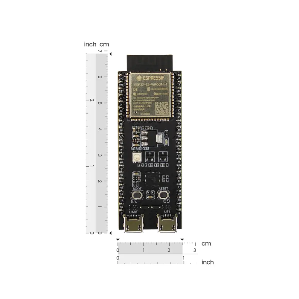 El LED RGB direccionable conectado a GPIO48 ofrece una función útil para la retroalimentación visual, lo que lo hace ideal para aplicaciones que requieren indicación de estado o efectos de iluminación. La alimentación se gestiona con precisión mediante un LDO de 5 V a 3,3 V, lo que garantiza un rendimiento estable en todos los componentes. Además, la placa cuenta con un LED de encendido de 3,3 V que indica la conexión de alimentación activa, junto con botones de arranque y reinicio para la descarga de firmware y el reinicio del sistema.
