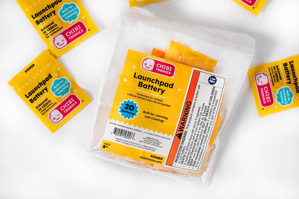 Cada paquete incluye 20 pilas de 3 voltios cada una, convenientemente empaquetadas en una bolsa de almacenamiento con cierre hermético. Las pilas son compatibles con varios materiales conductores como la cinta de tela conductiva y los clips de cocodrilo, y se pueden usar con luces como los LED de Launchpad y los LED de Circuit Sticker.