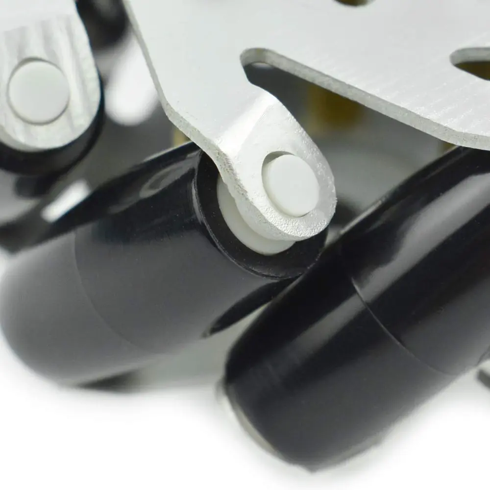Cada rueda tiene un diámetro de 65 mm y está compuesta por nueve rodillos de plástico recubiertos de silicona de alta calidad y alta fricción. Este material especializado proporciona una gran durabilidad y un agarre superior, cruciales para afrontar diversos terrenos con confianza y resistencia. Estas ruedas Mecanum ofrecen un medio fiable y eficiente para optimizar sus exploraciones robóticas, garantizando que su máquina pueda afrontar con destreza movimientos y desafíos complejos.