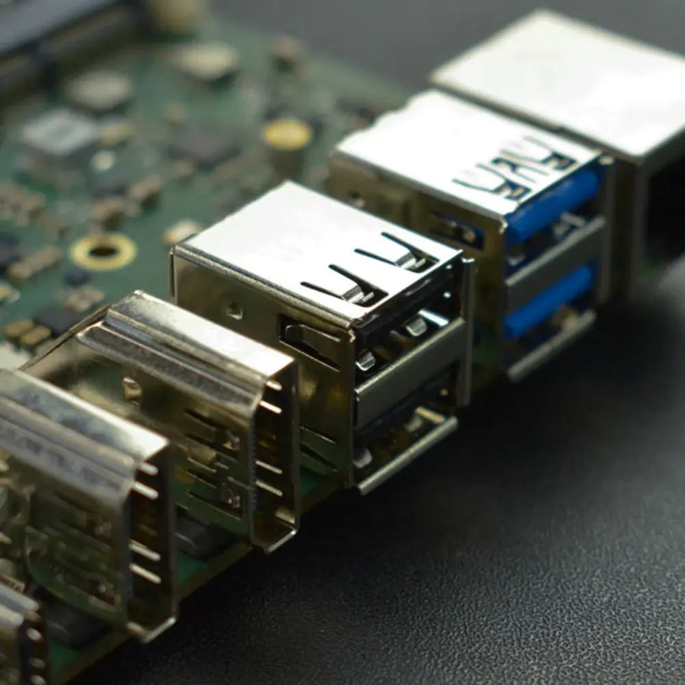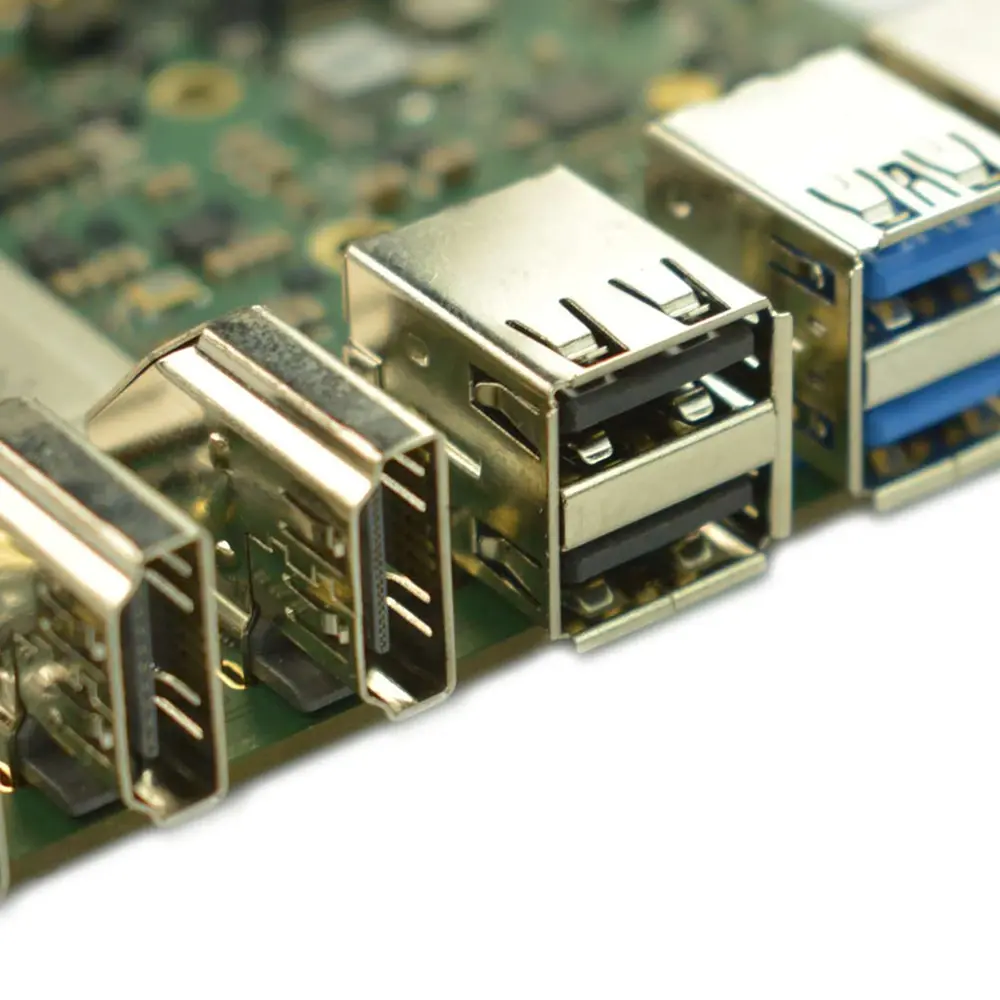 Compatible con pantallas 8K, el ROCK 5B, equipado con una GPU Arm Mali G610MC4, es ideal para aplicaciones multimedia sofisticadas. Ofrece dos puertos HDMI, compatibles con dos pantallas que alcanzan una impresionante resolución de 8Kp60, además de una entrada micro-HDMI para 4Kp60 y salida de audio estéreo mediante un conector de 3,5 mm.
