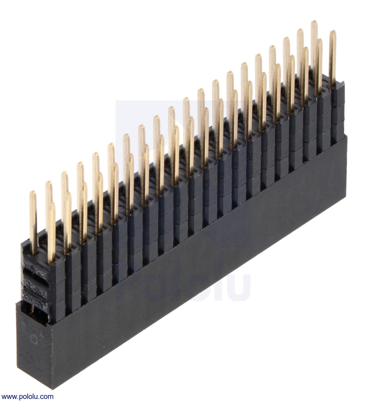 Este cabezal hembra extra alto apilable de 40 pines cuenta con dos filas de 20 pines espaciados con un paso de 0,1″ (2,54 mm). Incluye tres espaciadores de 0.1″ de espesor para espacio libre adicional, y los pines extendidos permiten apilar varias unidades como se populariza en los escudos de Arduino. El tamaño 2×20 se usa notablemente en los modelos A+ y B+ de Raspberry Pi, y los 0,3″ adicionales de altura permiten que las placas apiladas despejen todos los componentes en el Raspberry Pi B+.
